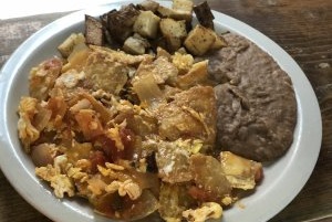 Eggs, potatoes, cheese, and your choice of bacon, sausage or chorizo. Scrambled all together on the grill with 2 tortillas.