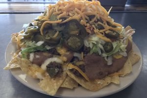 Beans, cheese, lettuce, tomato, guacamole, sour cream, and jalapeños. Choose from ground beef or fajita meat.